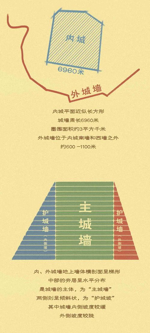 “鄭州商城遺址近似長方形,面積有二十五平方公里。城垣高大,北城墻長約1690米,西墻長約1870米,南墻和東墻長度均為1700米,周長近7公里。城墻底寬20米左右,頂寬5米多,其高度復(fù)原后約10米。”