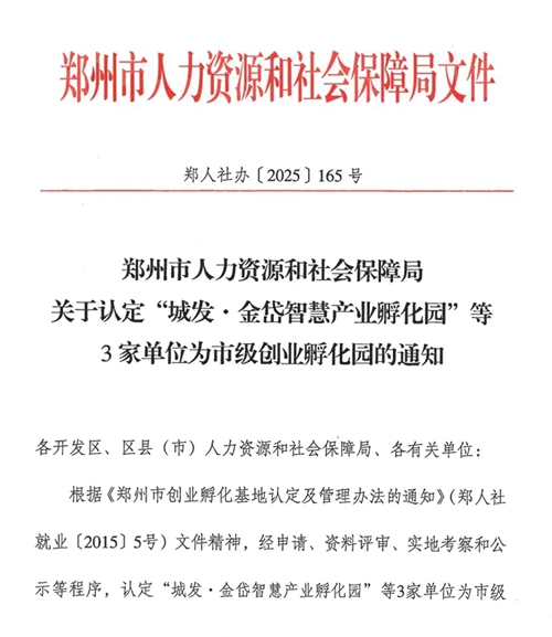 近日,鄭州市人力資源和社會保障局發(fā)布關(guān)于認定“城發(fā)·金岱智慧產(chǎn)業(yè)孵化園”等3家單位為市級創(chuàng)業(yè)孵化園的通知。根據(jù)《鄭州市創(chuàng)業(yè)孵化基地及管理辦法的通知》(鄭人社就業(yè)〔2015〕5號)文件精神,經(jīng)申請、資料評審、實地考察和公示等程序,認定“城發(fā)·金岱智慧產(chǎn)業(yè)孵化園”等3家單位為市級創(chuàng)業(yè)孵化園,并頒發(fā)鄭州市創(chuàng)業(yè)孵化園榮譽牌匾。