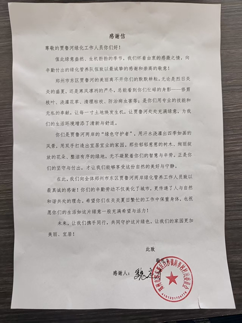 守護(hù)賈魯河的生態(tài)之美,是綠化養(yǎng)護(hù)人矢志不渝的責(zé)任與光榮使命。每一片蔥郁的樹林、每一處綻放的花海、每一聲清脆的鳥鳴,都見(jiàn)證著養(yǎng)護(hù)團(tuán)隊(duì)的匠心與堅(jiān)守。此次收到鄭東新區(qū)崗李村村委的錦旗和感謝信,令全體團(tuán)隊(duì)倍感鼓舞。這不僅是對(duì)養(yǎng)護(hù)團(tuán)隊(duì)專業(yè)能力的認(rèn)可,更是對(duì)賈魯河生態(tài)治理成效的高度肯定。
